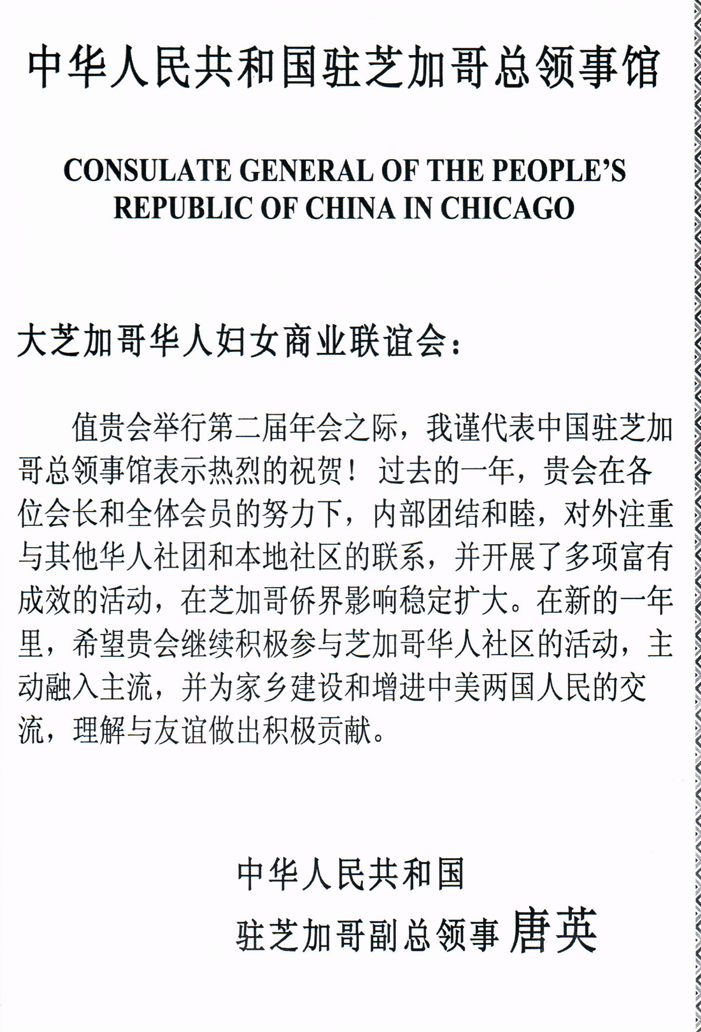 中国住芝加哥总领事馆副总领事